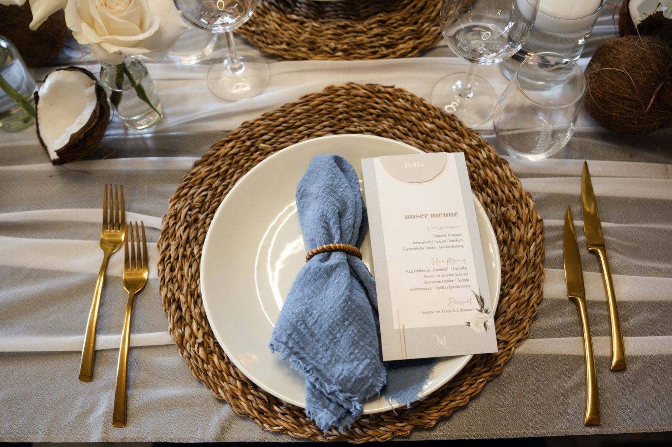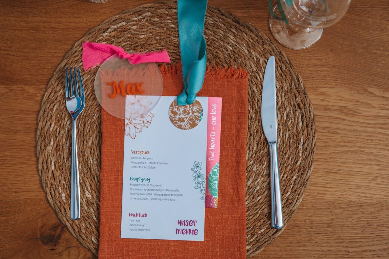 Mit einer liebevoll gestalteten Menükarte erfahren eure Gäste, welche kulinarischen Highlights sie erwarten. Ob klassisch auf hochwertigem Papier, kreativ in besonderen Formen oder als Teil eines Tischdekors – ich setze euer Menü optisch so in Szene, dass es Appetit auf mehr macht.