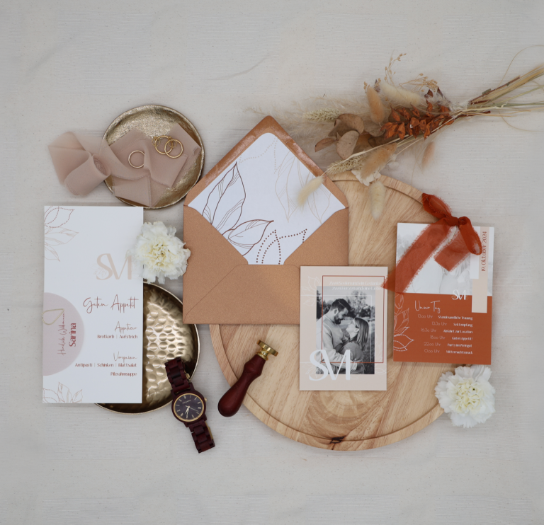 Von Save-the-Date bis zur Dankeskarte – alle Elemente eurer Papeterie sind harmonisch aufeinander abgestimmt. So entsteht ein stimmiges Gesamtbild, das eure Gäste vom ersten Moment an begeistert.